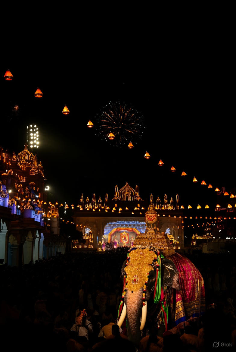 The route winds through key landmarks like K.R. Circle and Ashoka Road, culminating back at the palace amid fireworks and cheers. For the first time in recent years, drone shows are set to add a modern twist, with evening performances starting around 5:00 PM. Tickets for premium viewing, including the Gold Card for the procession and torchlight parade, are in high demand, priced at ₹1,000 for the best vantage points.